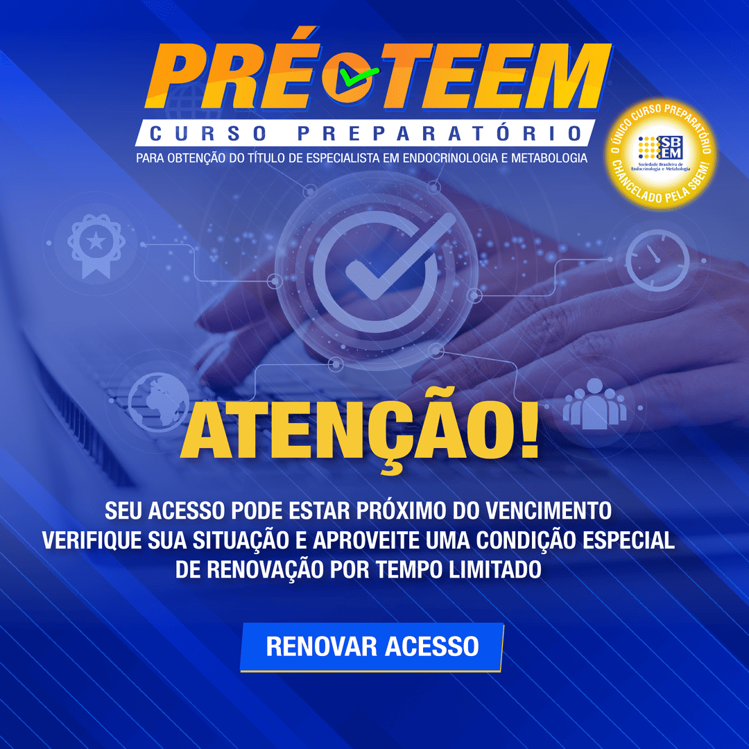 O PRÉ-TEEM é um curso preparatório para a Prova de Título de Especialista em Endocrinologia e Metabologia (TEEM), on demand, disponível em uma plataforma online para assinantes, que inclui videoaulas com professores renomados, banco de questões comentadas para autoavaliação e revisão de hot topics às vésperas da prova. A revisão de hot topics terá transmissão ao vivo, possibilitando a interação com os professores para esclarecimento das dúvidas nessa fase crucial da preparação.
