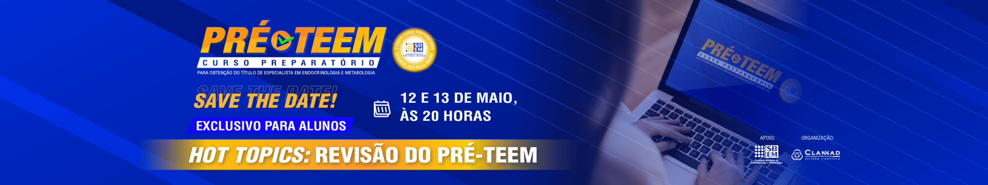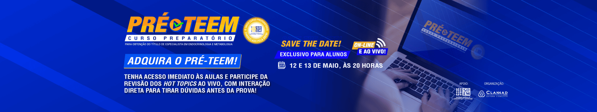 Desenvolvido pela Clannad Editora Científica, sob a coordenação técnica do Prof. Dr. Wellington Santana da Silva Júnior, o PRÉ-TEEM é o único curso preparatório chancelado pela Sociedade Brasileira de Endocrinologia e Metabologia (SBEM). Através de recursos didáticos modernos e tecnologias avançadas, o PRÉ-TEEM oferece os meios adequados para garantir uma preparação sólida para a obtenção do TEEM, o selo de qualidade do especialista emitido pela SBEM.